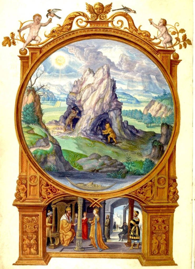When reading over this First Parable in the actual manuscript, do not be deceived as to the hidden, inner meanings. The protracted description might seem initially confusing for the first-time reader. Trismosin writes of the Earth outside and inside. Discern and study the differences, and be mindful of the allegories. Many sage writers speak of the ‘mountain’ of Spirit, and of ‘mining the Ore’ within the ‘earth’ of the physical body. In Latin ‘ore’ is aes, summing to 23, as is חיה, chaiah, Hebrew for the ‘Life-force’. Both are allusions to the First Matter. Notice the Sun at the upper left, the astrological symbol of which is a circle surrounding a central point. In occult arithmetic the point equals 1, the full circle, 22; together, 23.
