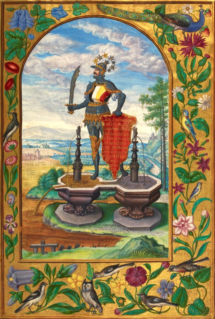 He stands upon two water fountains. The right is topped by a male child, the left by a female child. The scene personifies the complicated Second Treatise within the manuscript that reiterates the teachings of Roger Bacon’s Mirror of Alchemy centuries before.