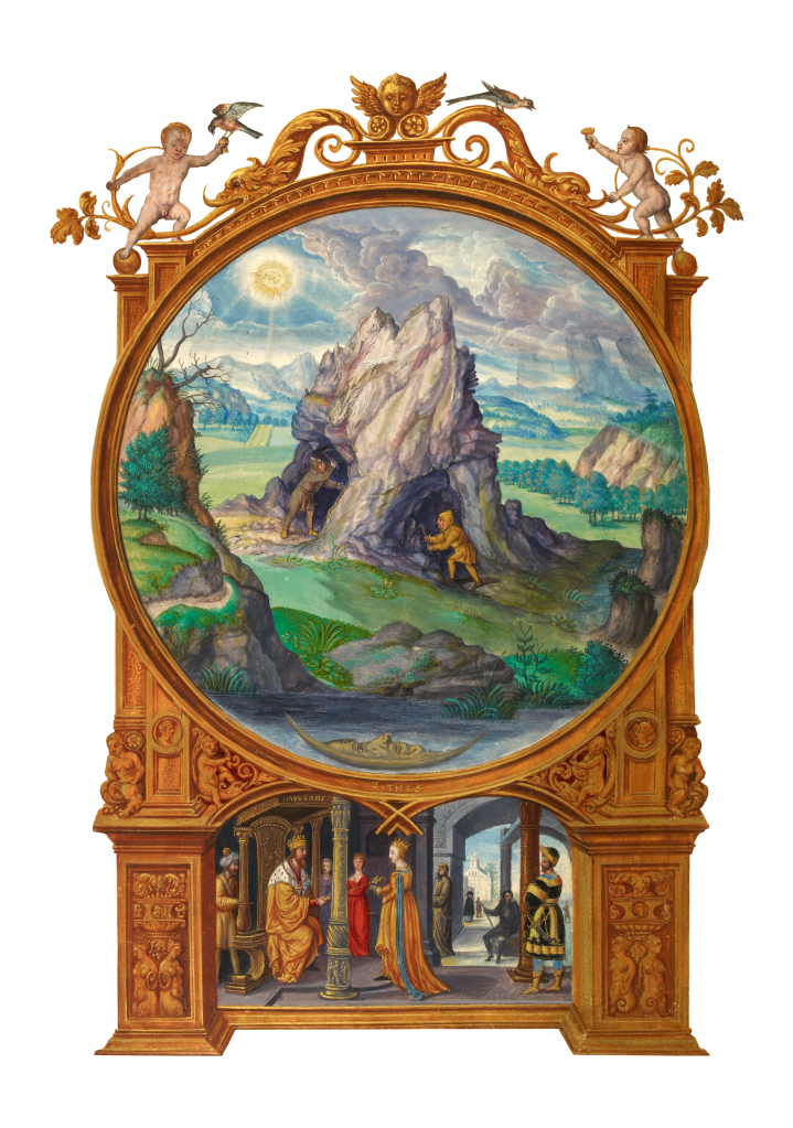 This is the first Plate where the lower base of the illustration comes into definite and pointed consideration. First, notice the lower arc portion of the large circle, under the crescent Moon. Barely discernible in this smaller representation is scribed the name Esther. Under the sphere is a scene from the Bible out of the Book of Esther 5:2. In the arched interior of his throne room King Ahasuerus (Xerxes I) holds out The Golden Scepter. In his commentary Julius Kohn notes that the king “is handing his Scepter to the Queen,” whereas in the Hebrew of the Scripture verse, Queen Esther only touched the tip of the Scepter (this allowed her to speak). Other than this specific scene with its alchemical implications, there seems to be no other organic connection between the Book of Esther and the alchemical theme of Splendor Solis that can be detected. The Biblical story addresses an injustice finally brought to Justice, freeing the Jews from annihilation. The Jewish Feast of Purim commemorates this occasion.