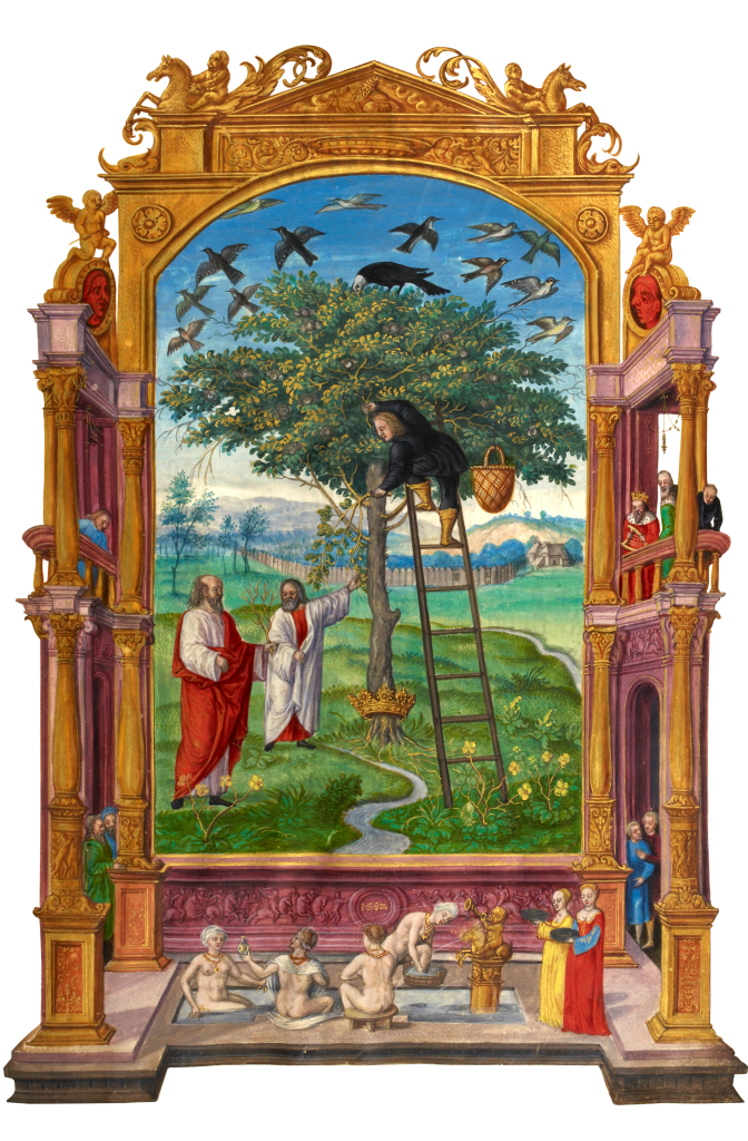 The very deep levels of Subconsciousness, represented by the four women in the Bath, are slowly being purified by our meditations with the help of the Christ Consciousness in the Four Worlds. They are being attended by the women representing Rajas Guna (Red/Sulfur) together with Sattva Guna (Yellow/Mercury) in the Metal, Silver; making “Mercury of Silver”, alchemically speaking. As long as these two modes within Subconsciousness are bound together progression on The Path is assured. The inconsequential aspects of the Self and Subconscious mental modes (the men and women gathered around, gawking at the central scene), have no direct bearing on the principal operation.