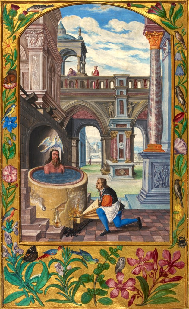 After the Herculean efforts performed previously by the aspirant as described through those parables, there is little to nothing that can be accomplished directly from the self-conscious level, except for these last details. The ‘worker’ at the right in the picture is another aspect of self-consciousness. We consciously keep the ‘fires’ of aspiration burning by continuing the regimens of reading, studying and breath-control during meditations (the bellows). The glass retort at the base of the ‘bath’ is the oil, the symbol for Kundalini at the ready.