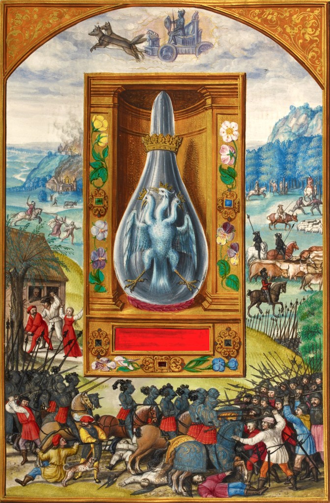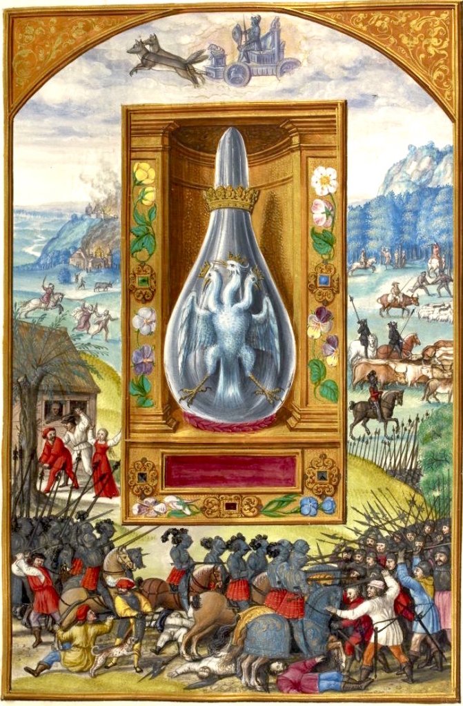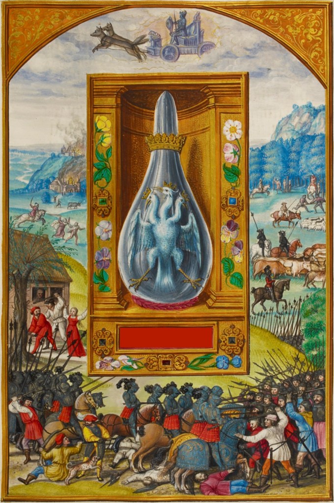 Not so clear are the details on the cart wheels. Mr. Julius Kohn ‘sees’ a Goat on the first wheel, the symbol of the astrological sign Capricorn in which Mars is Exalted; then a Crab (?) on the back wheel, the sign of Cancer, within which Mars is in its Fall. That back wheel is partly obscured by clouds, so the benefit goes to Mr. Kohn, who might have actually seen the original manuscript or even spoke with one knowing.