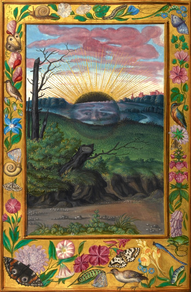 Not shown in this illustration are the border embellishments in the original. At center-below is a chrysalis of a butterfly while at center-above is a caterpillar, with other hints around suggesting metamorphoses. That is the theme of this sinking sun; metamorphosis.