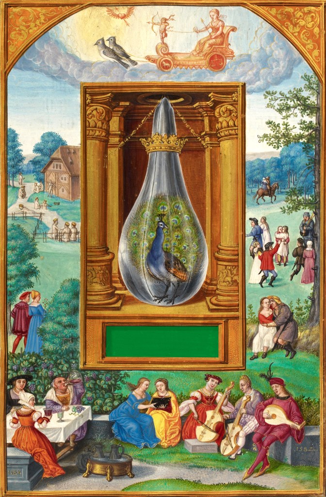 The cart above the Jupiter retort is pulled by two Peacocks, while the one Peacock is central in this Venus retort. Pavo, ‘peacock’, sums to 47 in the Latin Cabala Simplex. This equals Rosa, ‘Rose’, and hints the direct message. Mr. Paul F. Case tells us:
