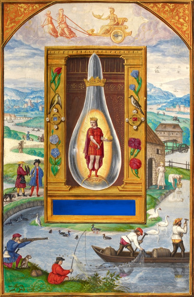 The Kingly male in the retort stands on the “cold side of the Moon”, pointed out in the Fourth Treatise, SEVENTHLY. Notice that his torso is turned to his left while he gazes to his right. This is the dual nature of the Moon, which is the ruler of Cancer, also one of the zodiacal dual signs.