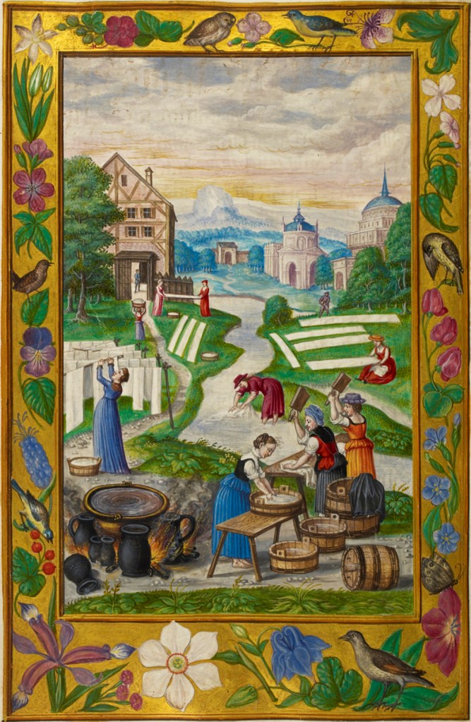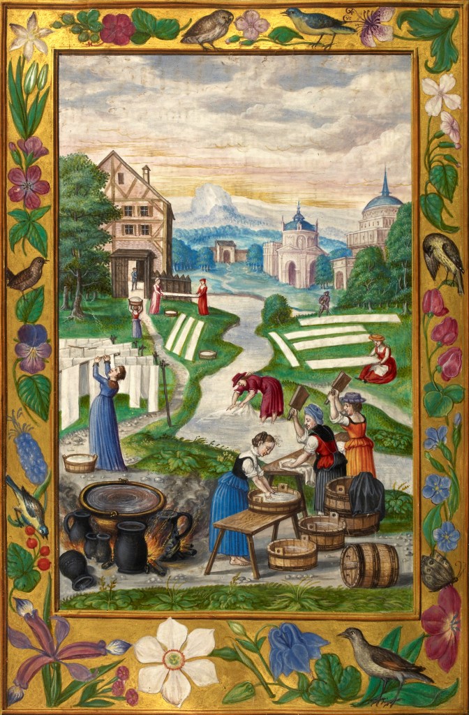 This plate is an illustration of the White Stage. It is also called Woman’s Work while it is familiar to most sages and philosophers as the ‘White Work of the Moon’. Mr. Trismosin makes the point most evident with this scene of the 9 women laundering and drying white material only.
